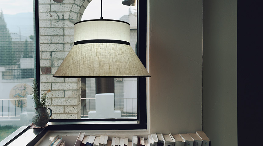 Combinación de diferentes texturas notoriamente remarcadas, obteniendo una lámpara de estilo contemporáneo.