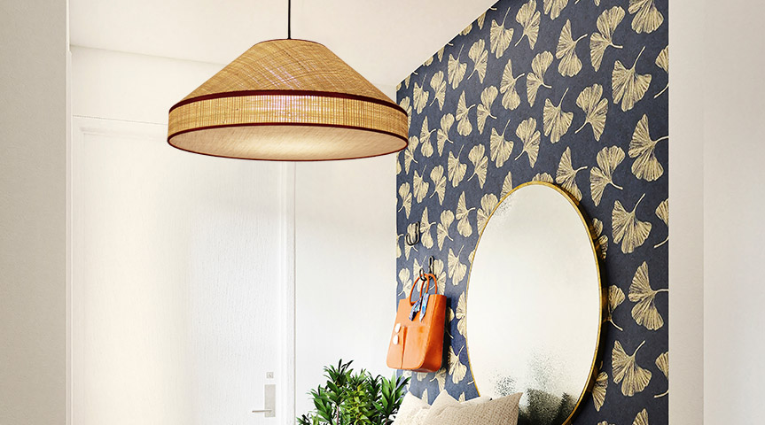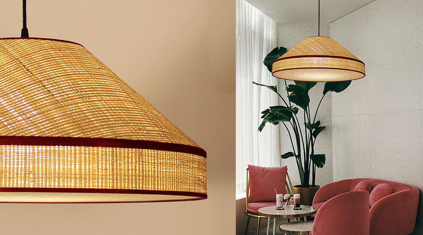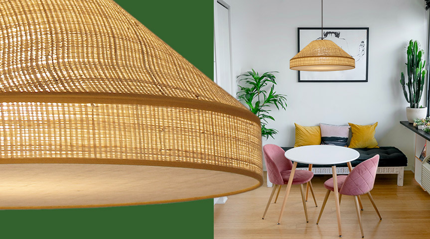 Lámpara de línea actual donde destacar la combinación de materiales naturales como rafias y linos.
